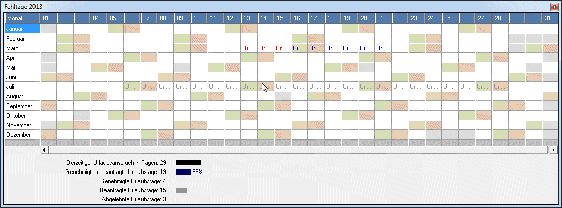 - den eigenen Jahresurlaubsplan mit genehmigten, beantragten und abgelehnten Urlaubstagen